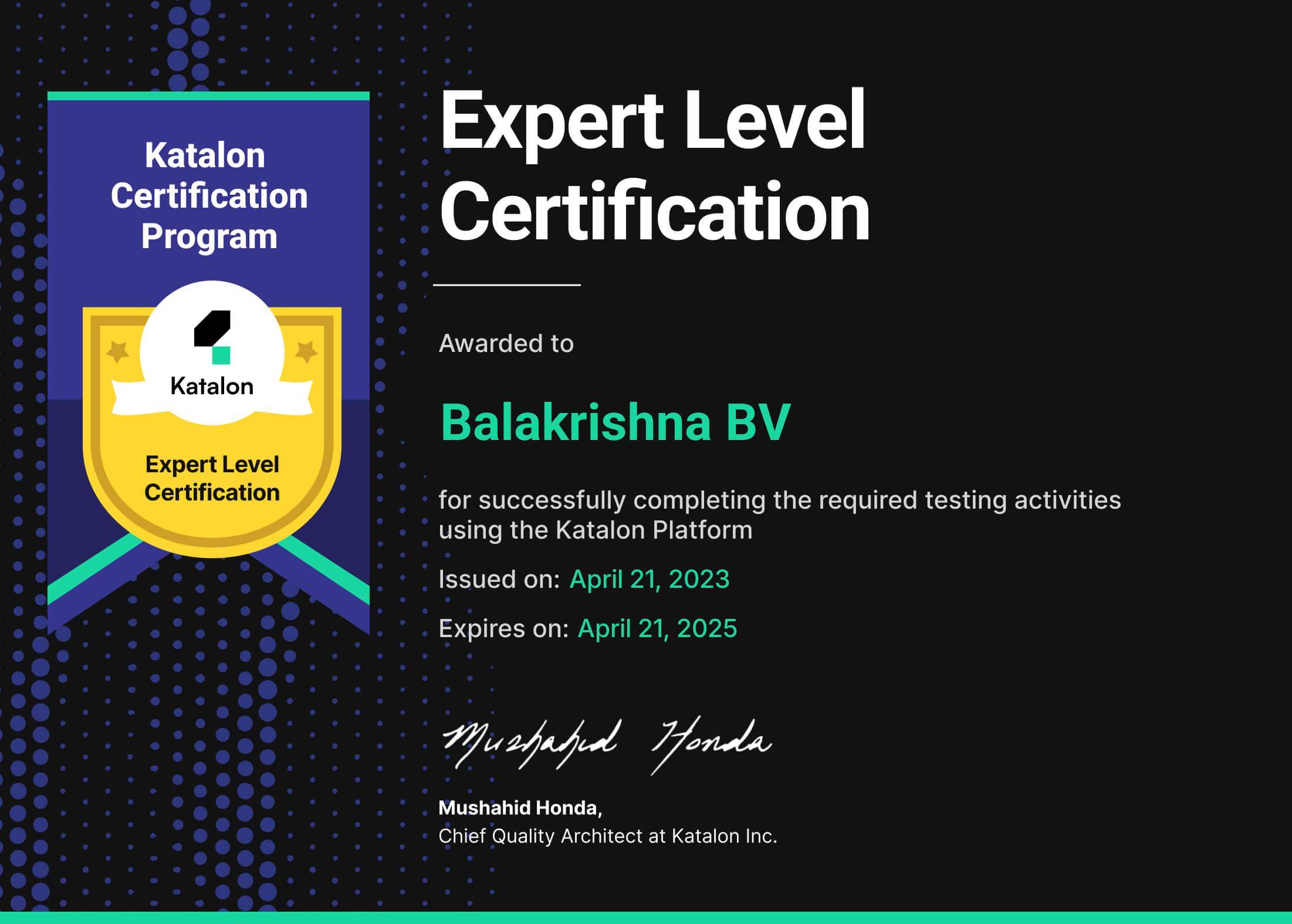 Katalon certifies the user for their understanding and extensive hands-on experience of using the Katalon platform for test automation, including: