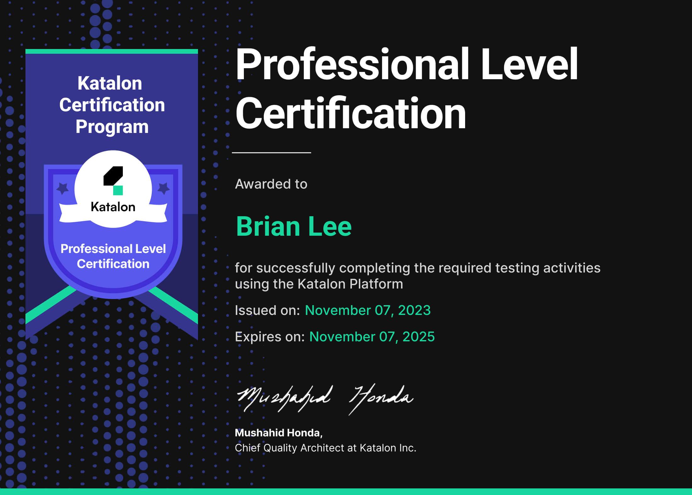 Katalon certifies the user for their solid hands-on experience of using the Katalon platform’s advanced features for test automation, including: