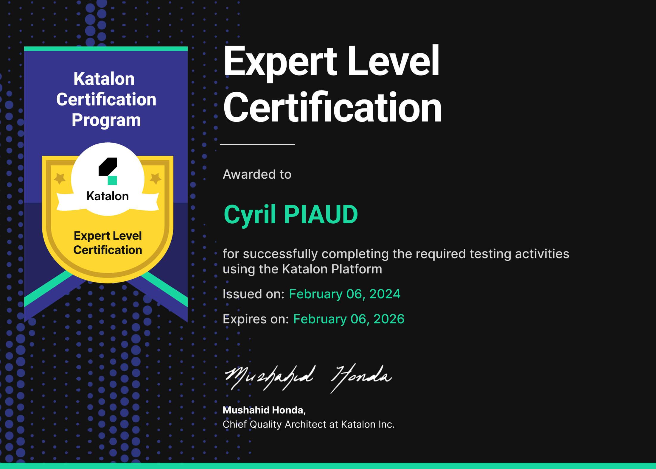 Katalon certifies the user for their understanding and extensive hands-on experience of using the Katalon platform for test automation, including: