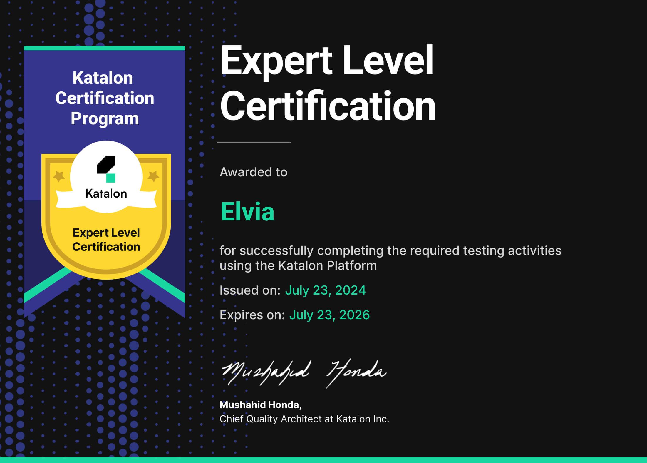 Katalon certifies the user for their significant ability and extensive hands-on experience of using the Katalon Platform effectively for test automation and overseeing testing quality, including: