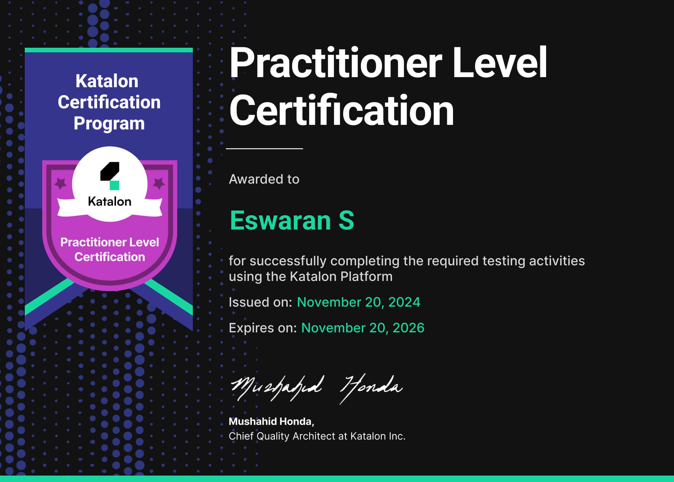 Katalon certifies the user for their understanding and hands-on experience of using Katalon Studio for test automation, including: