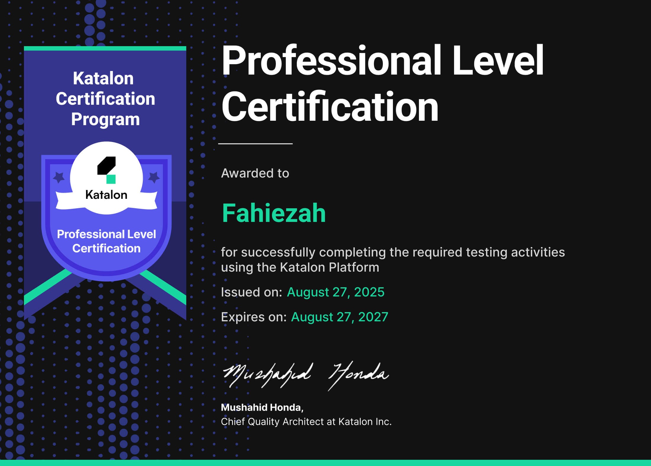 Katalon certifies the user for their hands-on experience and ability to perform efficient automated testing using advanced functionalities in Katalon Studio Enterprise and Katalon TestCloud environments, including: