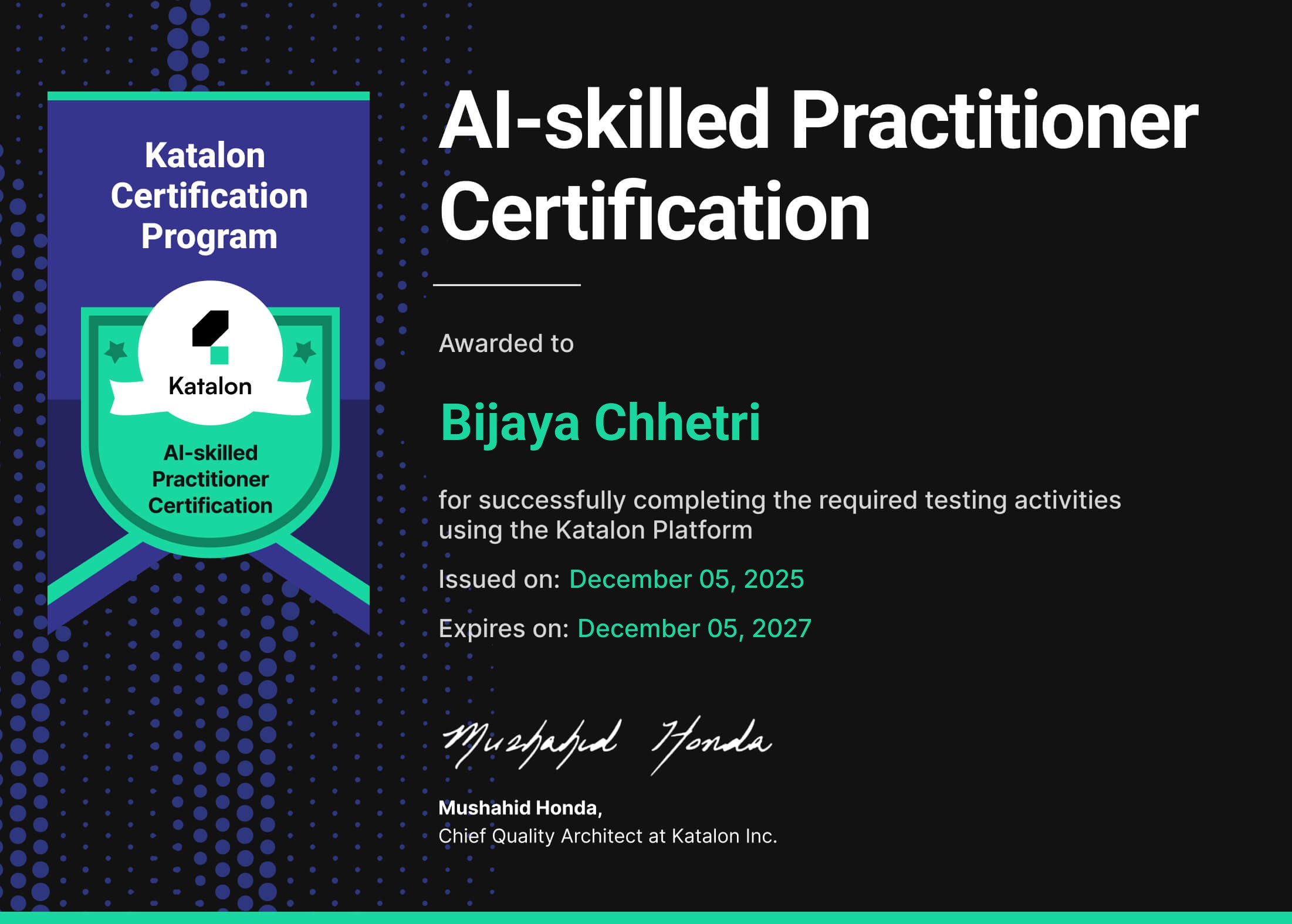 Katalon certifies the user for the ability to build and scale test automation with Katalon Studio Enterprise, using AI to boost speed and efficiency. The actitives they have completed: