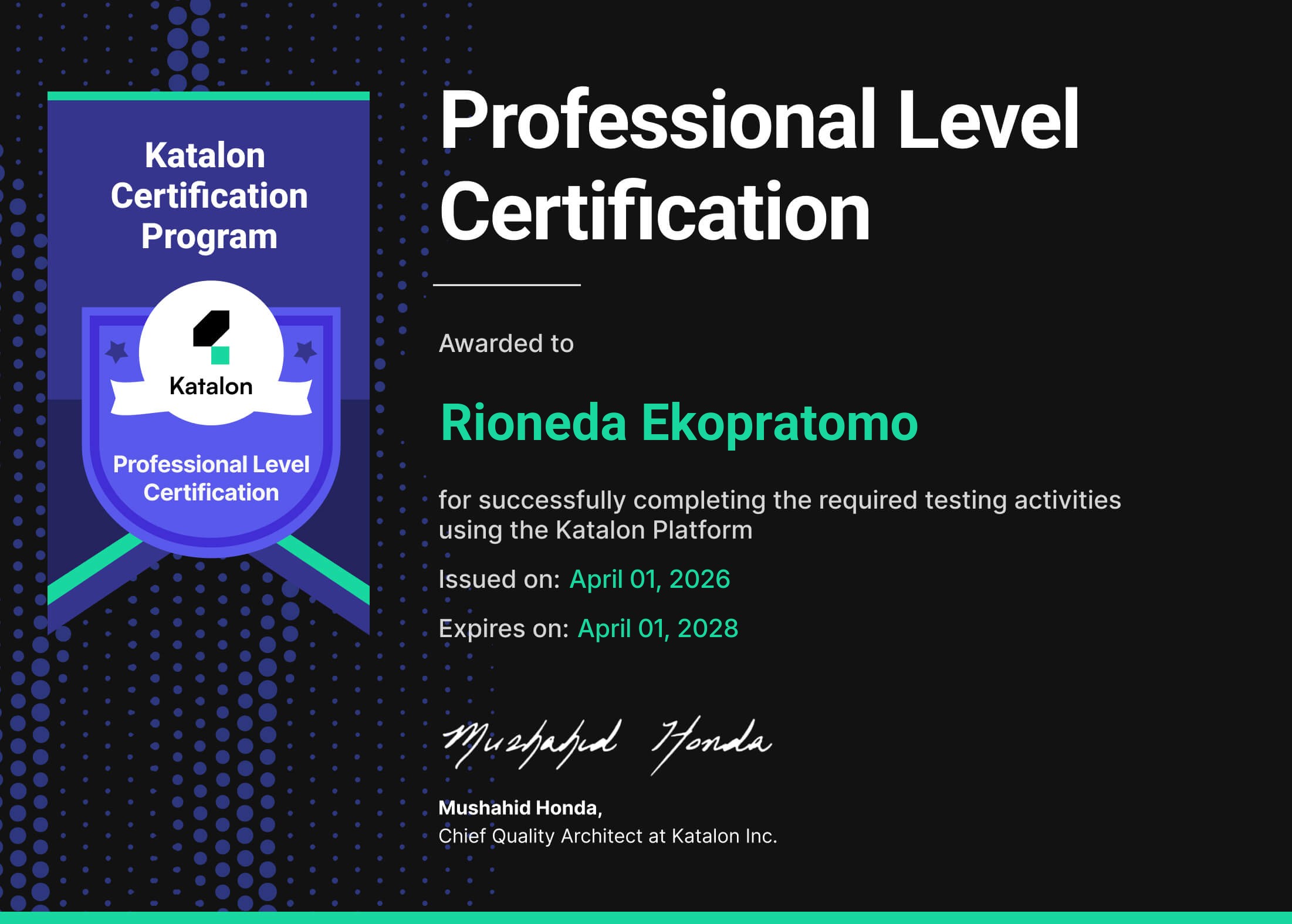 Katalon certifies the user for their ability to design, maintain, and execute efficient, scalable test automation projects.