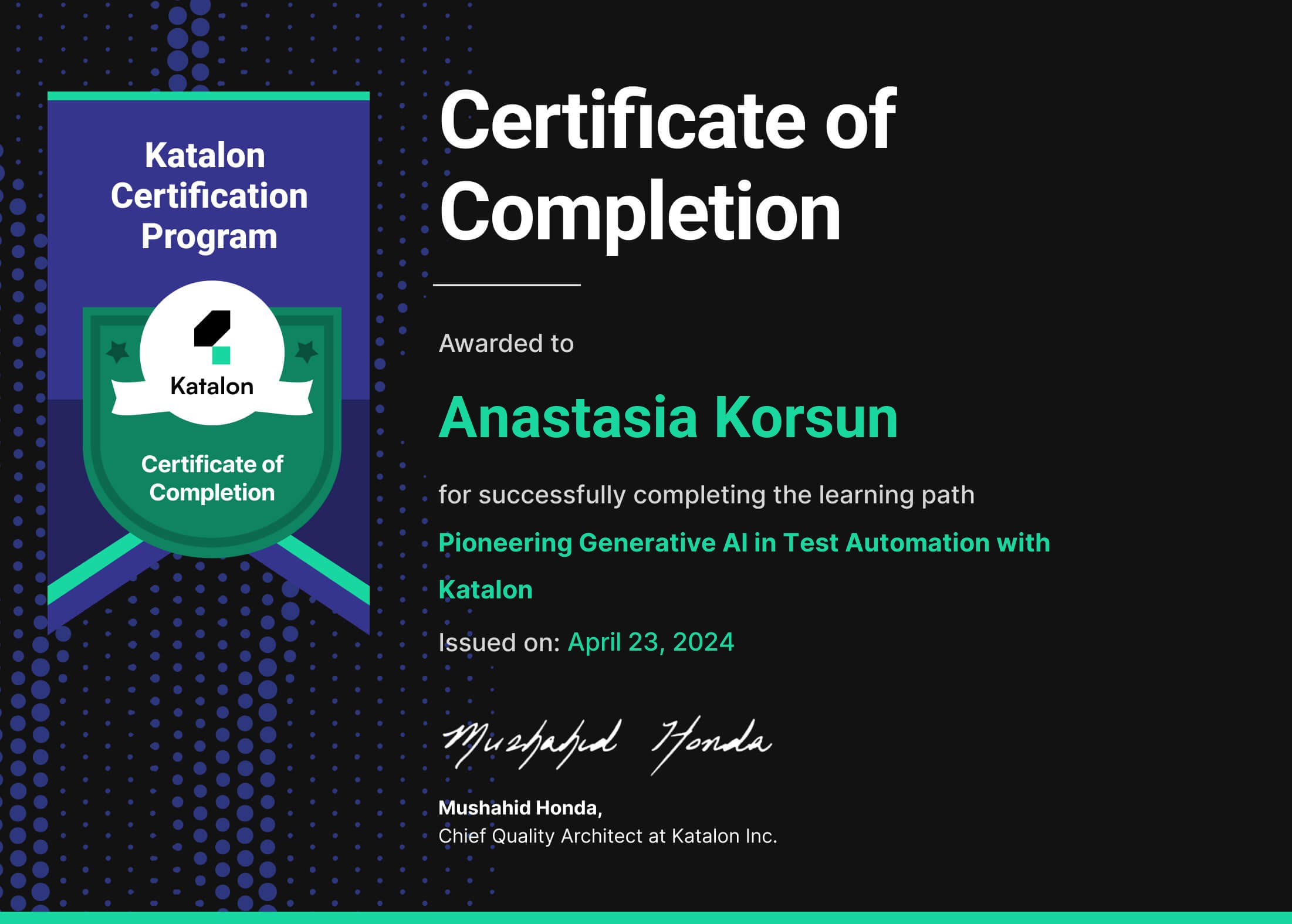 This Katalon certificate is earned after successfully completing all the courses in the learning path Pioneering Generative AI in Test Automation with Katalon. The learner has a foundational understanding of AI’s role and future potential in test automation and can use certain Katalon solutions to start incorporating AI to enhance their testing workflow.