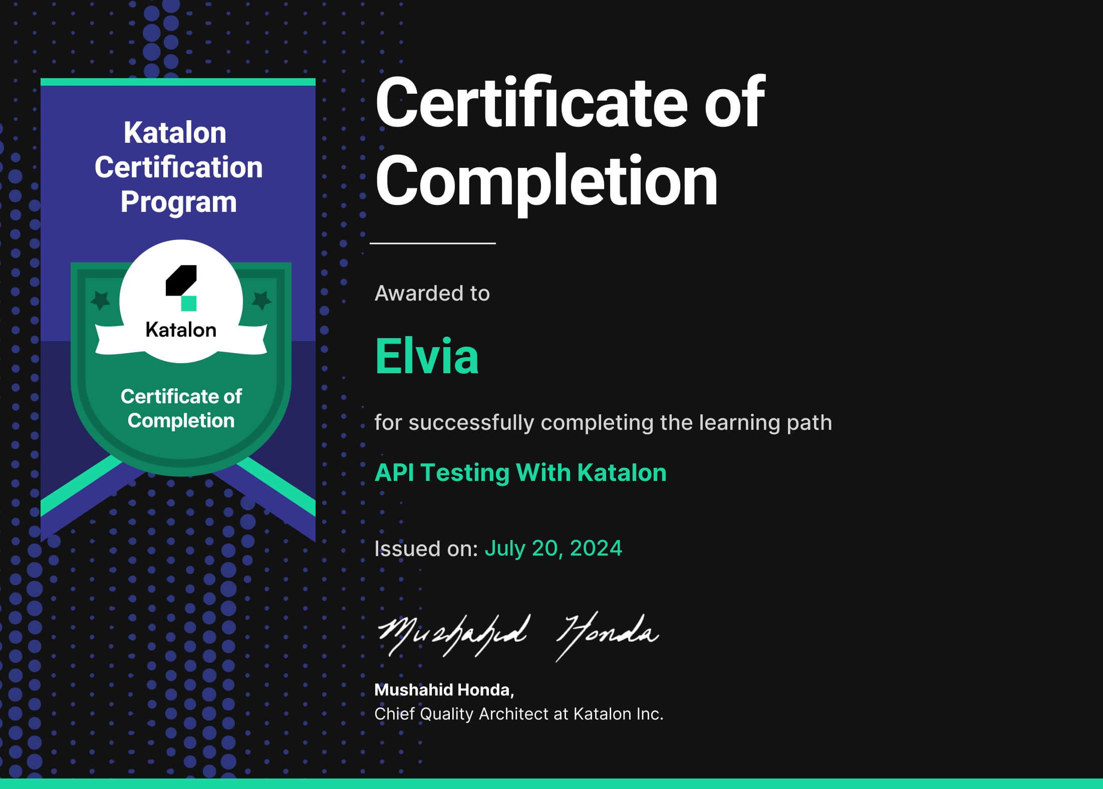 This Katalon certificate is earned after successfully completing all the courses in the learning path API Testing with Katalon. The learner understands how to use different Katalon solutions and techniques to create, organize, execute automated tests, and report for API testing projects.