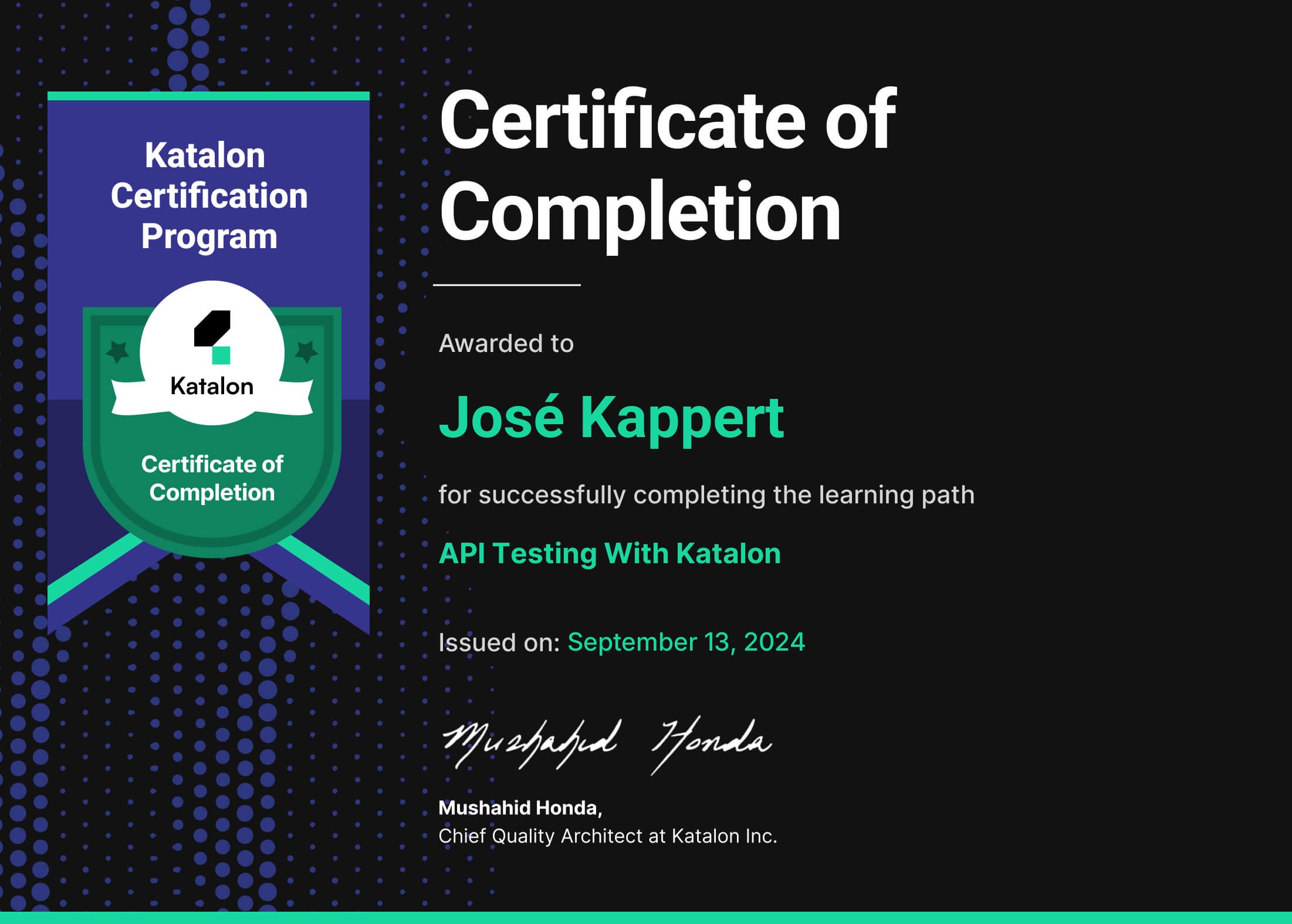 This Katalon certificate is earned after successfully completing all the courses in the learning path API Testing with Katalon. The learner understands how to use different Katalon solutions and techniques to create, organize, execute automated tests, and report for API testing projects.