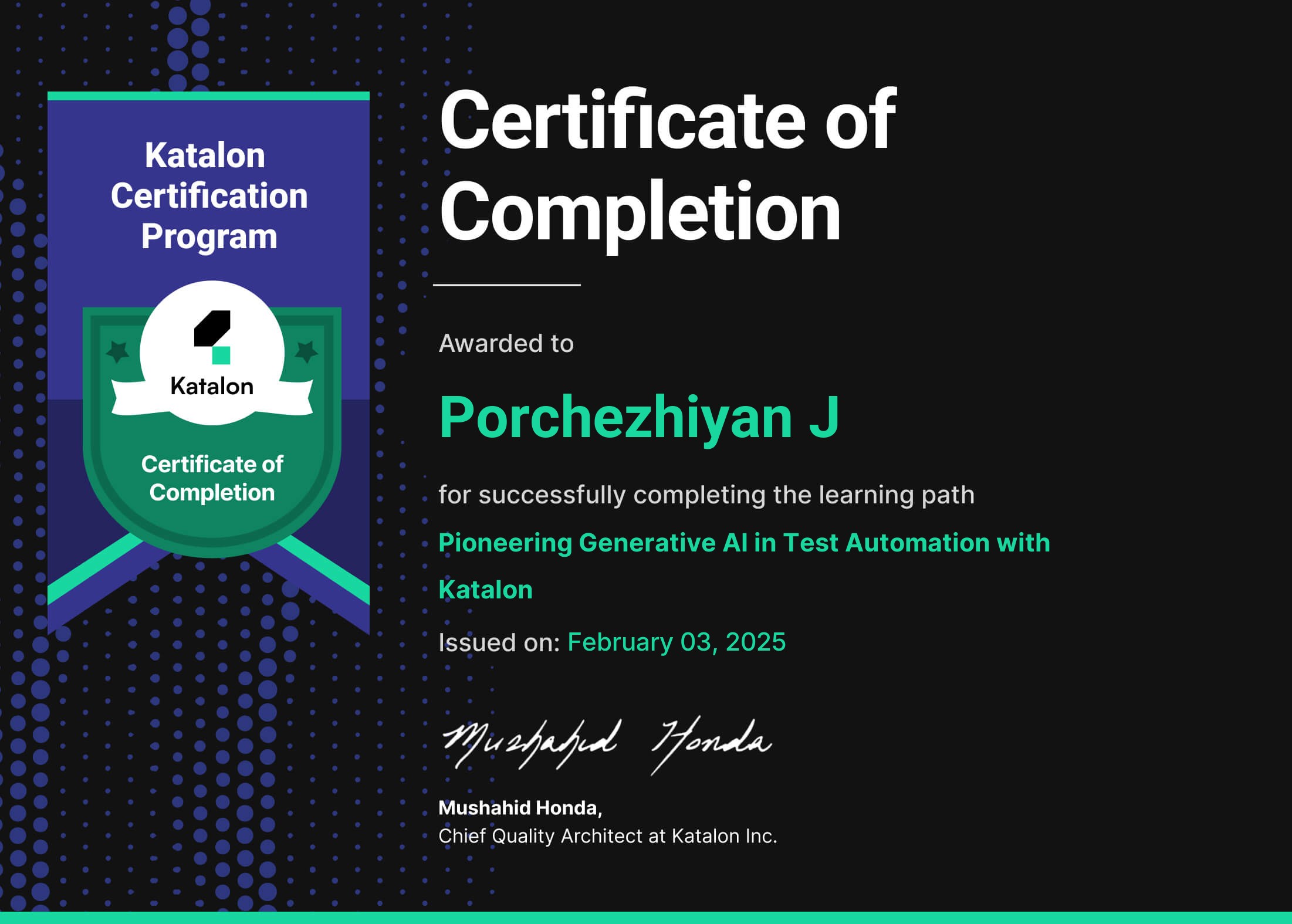 This Katalon certificate is earned after successfully completing all the courses in the learning path Pioneering Generative AI in Test Automation with Katalon. The learner has a foundational understanding of AI’s role and future potential in test automation and can use certain Katalon solutions to start incorporating AI to enhance their testing workflow.