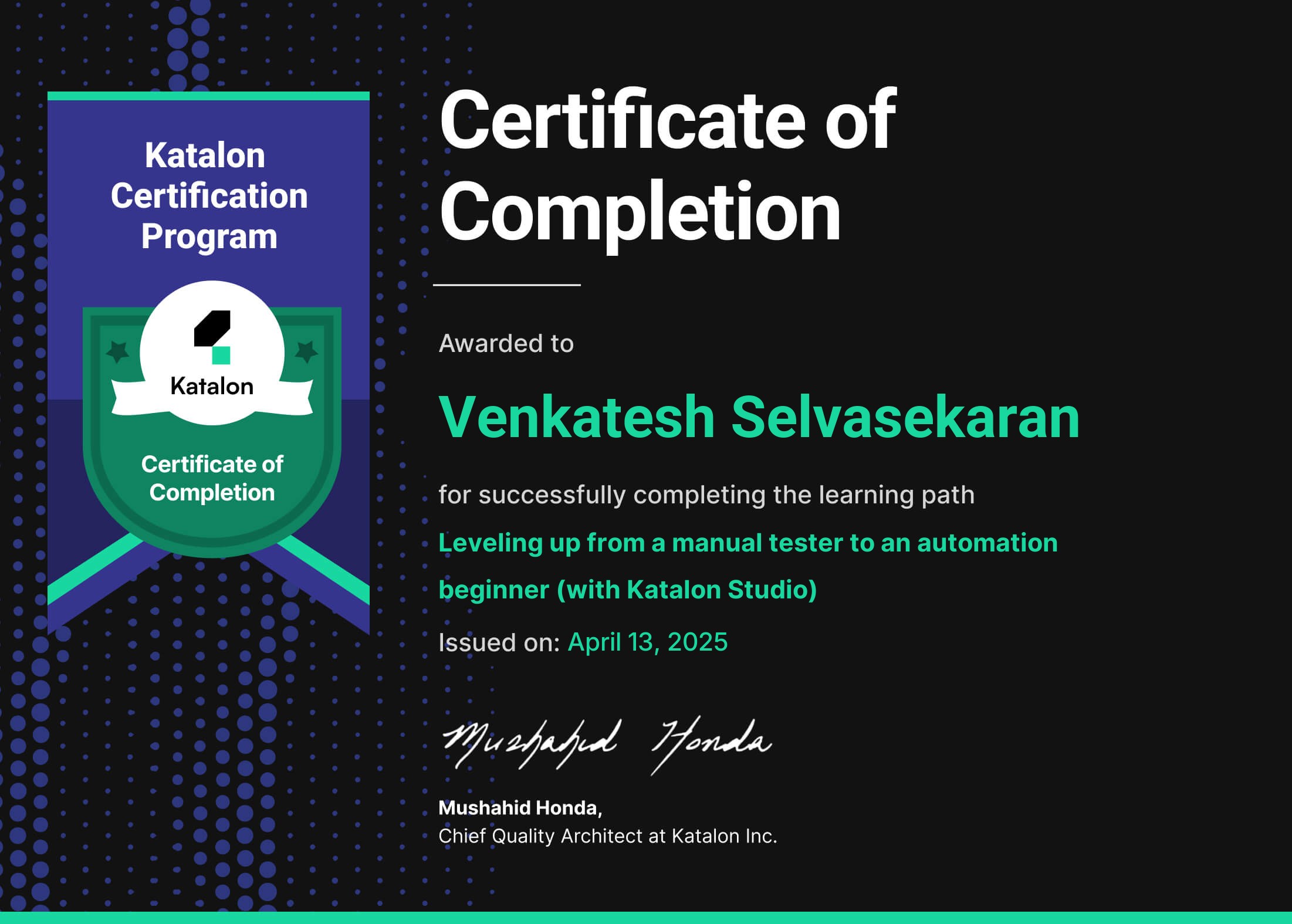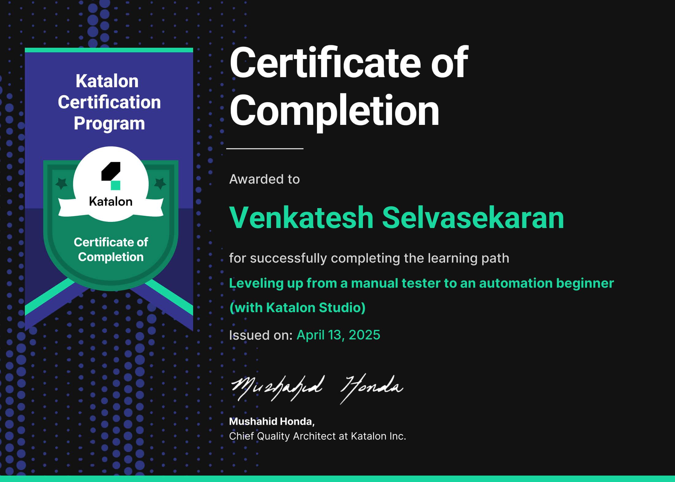 This Katalon certificate is earned after successfully completing all the courses in the learning path Leveling up from a manual tester to an automation beginner (with Katalon Studio). The learner understands the fundamentals of software testing, and can create, organize, and execute automated tests using Katalon Studio.