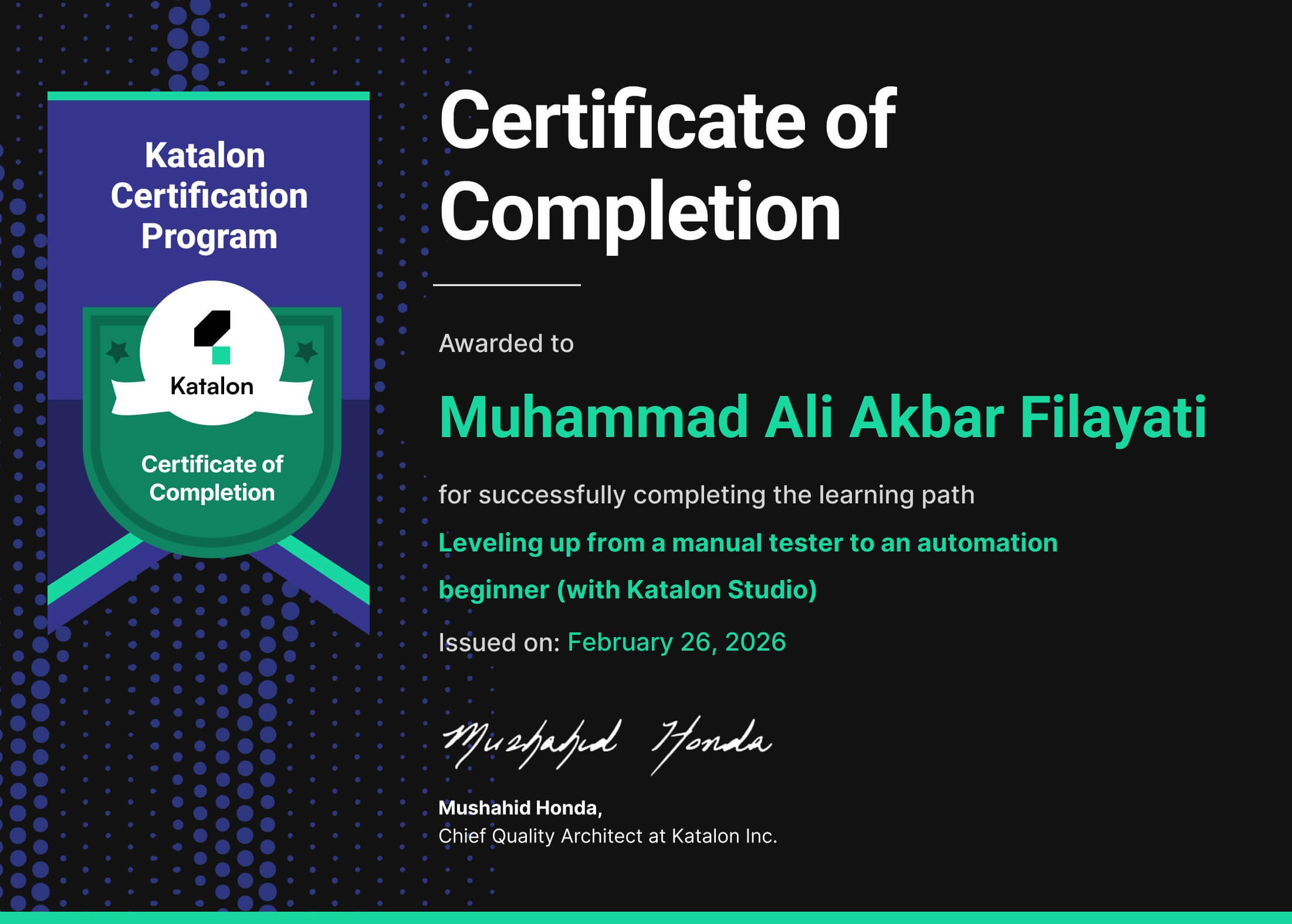 This Katalon certificate is earned after successfully completing all the courses in the learning path Leveling up from a manual tester to an automation beginner (with Katalon Studio). The learner understands the fundamentals of software testing, and can create, organize, and execute automated tests using Katalon Studio.